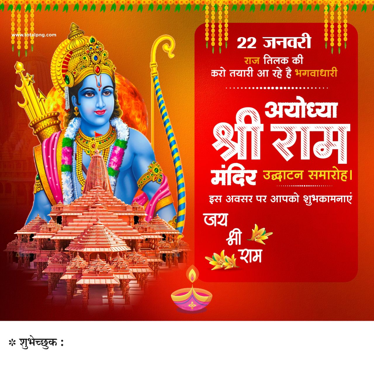 Boost your artistic projects with the adaptable Ram Mandir Ayodhya Pran Pratishtha Shubhkamnaye Banner 2024 image and witness your creative ideas come to life in remarkable ways.